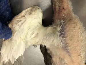 羽根の付け根や、足の付け根付近は太い毛が残っている為、必要に応じて、その部分をお客様で毛抜き作業をお願いします。